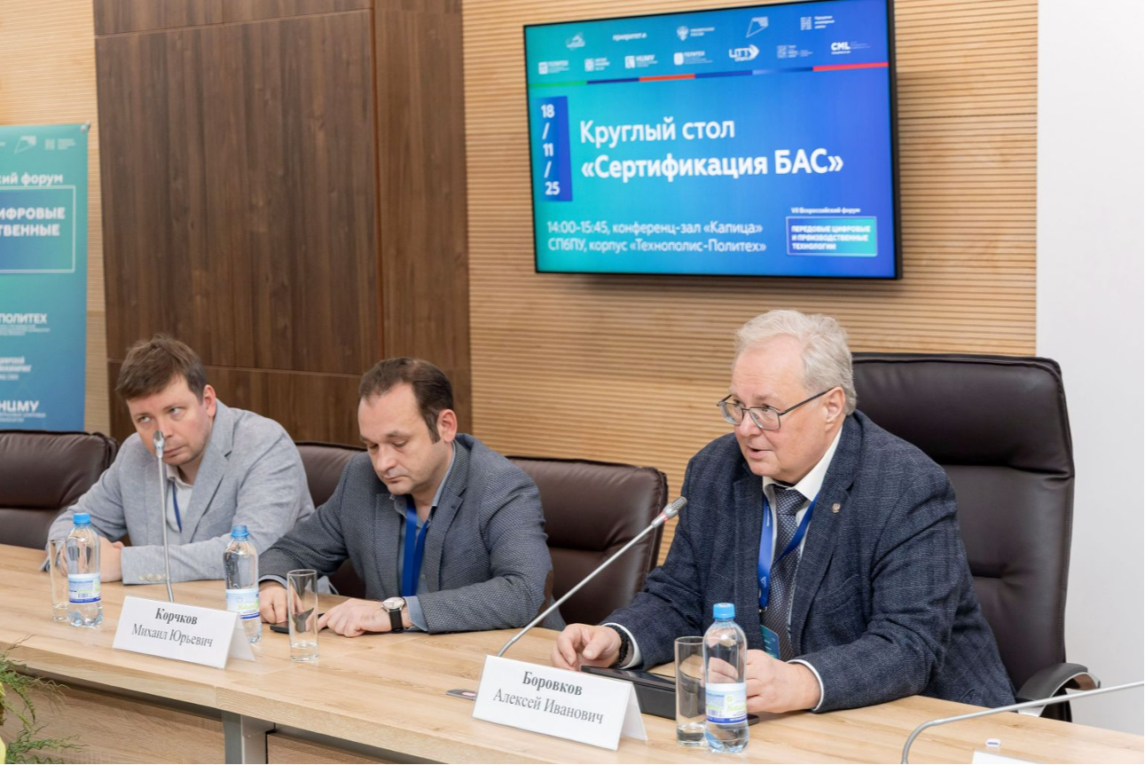 18 ноября 2025 года состоялся круглый стол «Сертификация БАС», который был посвящен обсуждению проблем сертификации беспилотных летательных аппаратов, с которыми сталкиваются участники отрасли. В мероприятии принял участие Павел Морозов (на фото слева), начальник отдела экспериментально-цифровой сертификации компании ТЕСИС.