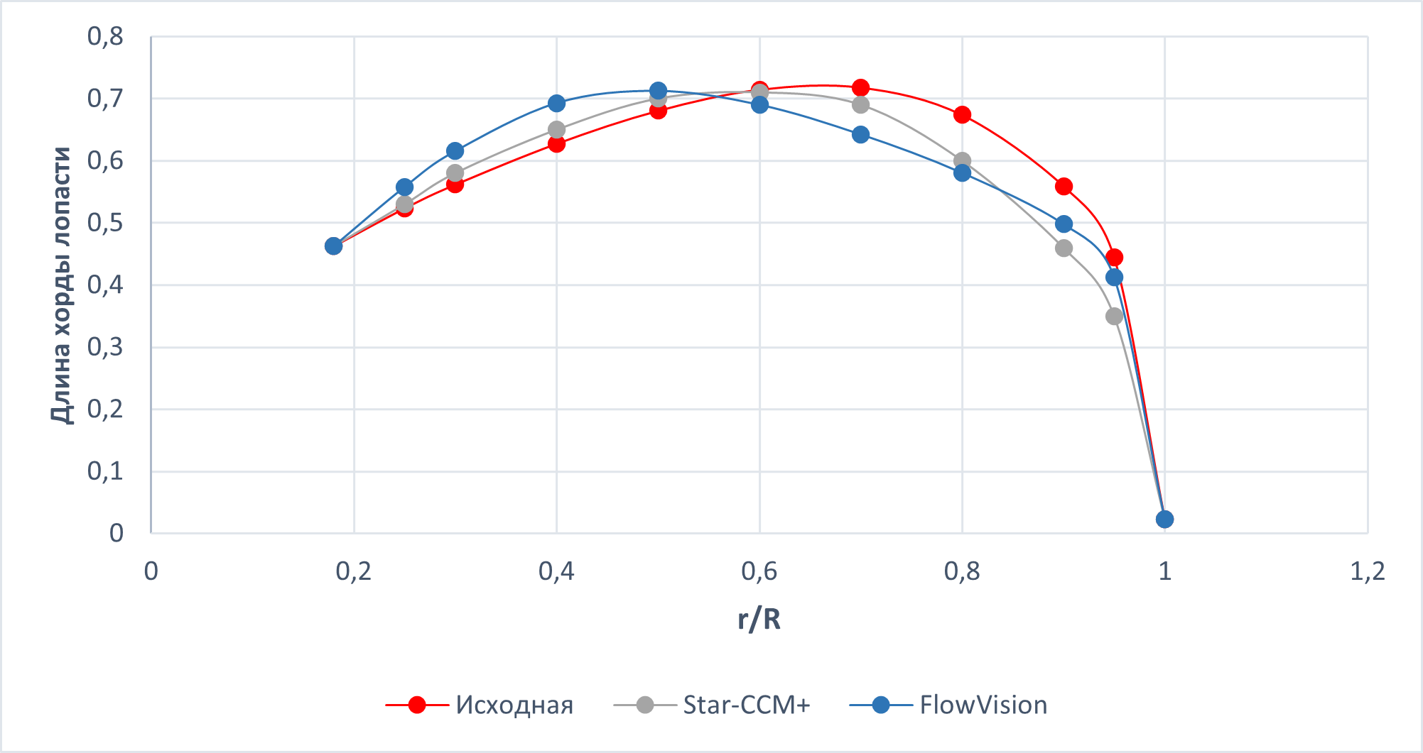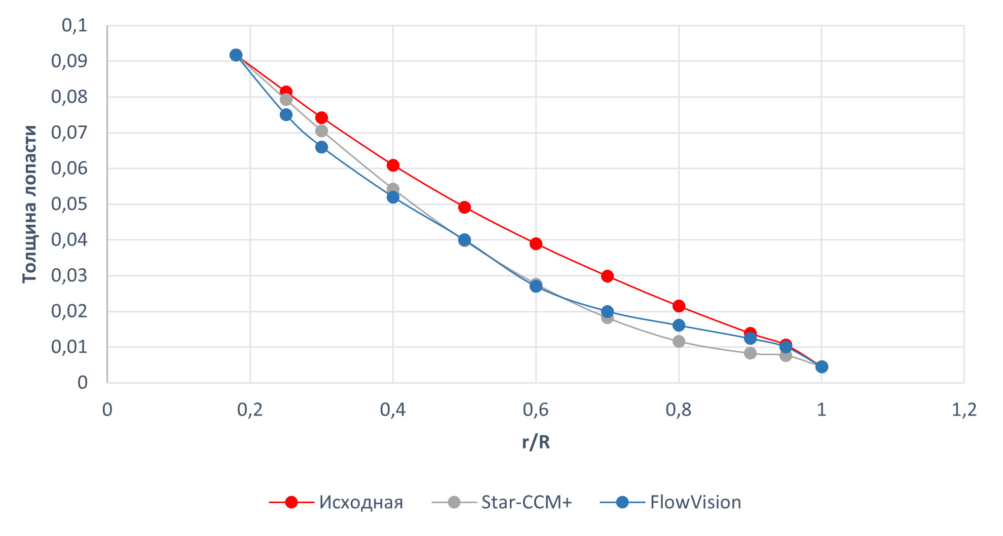 На рисунке 10 видно, что при оптимизации с применением связки «Star-CCM+ и DT Seven» предлагается немного расширить лопасть на корневых сечениях и сузить ее на концевых. Оптимизатор IOSO в связке с FlowVision предлагает сделать то же самое, только диапазоны изменений больше.