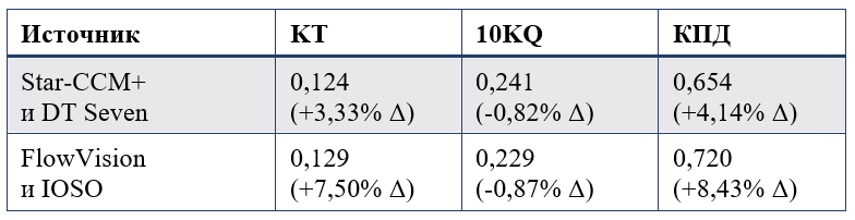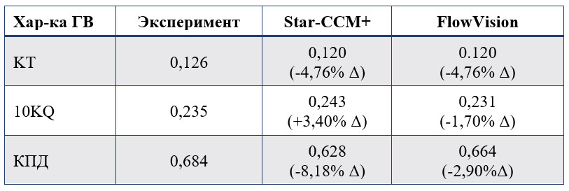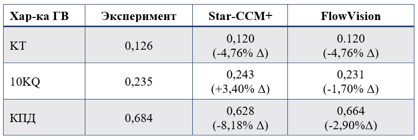 Анализ данных показал, что при одинаковых условиях моделирования FlowVision удалось точнее приблизиться к результатам эксперимента в сравнении со Star-CCM+. Если коэффициент упора оба решателя прогнозируют одинаково, то по коэффициенту момента у FlowVision отклонение от эксперимента в два раза меньше – 1,7% против 3,4%. Это связано с более точным прогнозированием трения в пристеночных слоях, что в свою очередь позволило точнее рассчитать КПД.