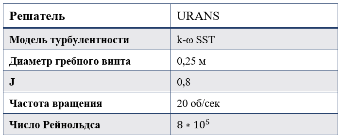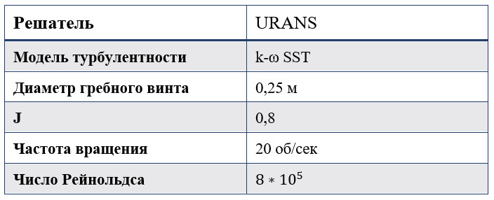 Моделирование обтекания KP505 выполнялось в нестационарной постановке с использованием осредненных по Рейнольдсу уравнений Навье-Стокса, замкнутых моделью турбулентности k-ω SST Ментера. Расчетные данные, используемые в задаче указаны в таблице 1