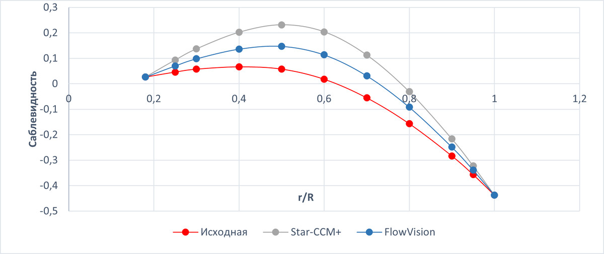 Что касается саблевидности, то оба оптимизатора предлагают значительно увеличить её по всей длине лопасти (Рис. 11). Связка решателя FlowVision и оптимизатора IOSO представляет вариант увеличения поскромнее в сравнении со Star-CCM+ и DT Seven. Это является разумным компромиссом, поскольку такой винт будет проще в изготовлении.