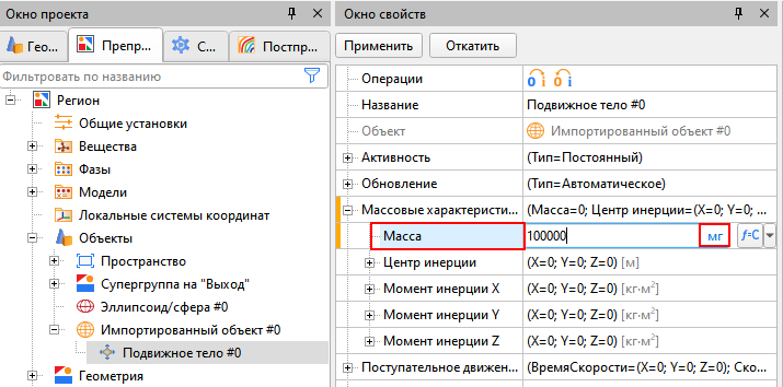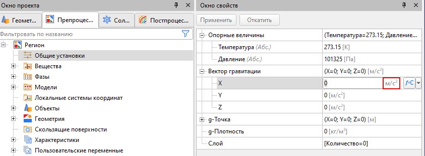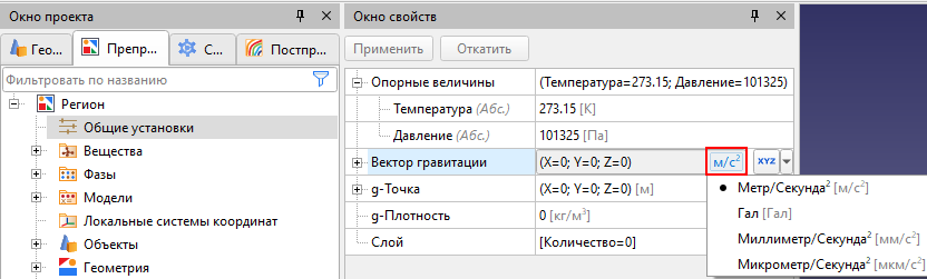 В окне свойств различных объектов дерева проекта есть размерные величины, теперь рядом с каждой указана ее единица измерения. Если после нажатия курсором мыши по полю ввода значения единица измерения серая, значит изменить ее нельзя. К примеру, в разделе «Общие установки» компоненты вектора гравитации имеют «серые» единицы измерения:
