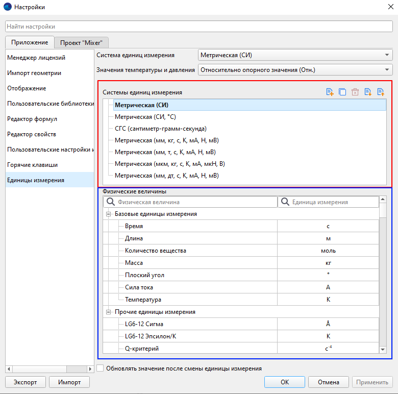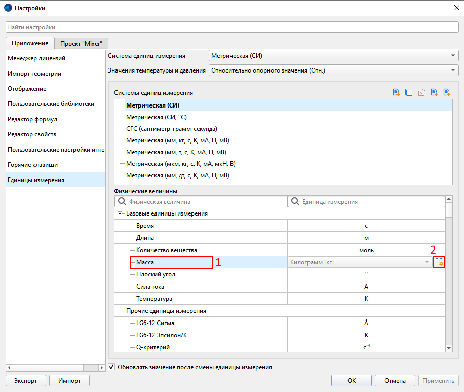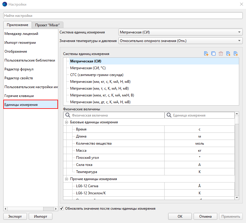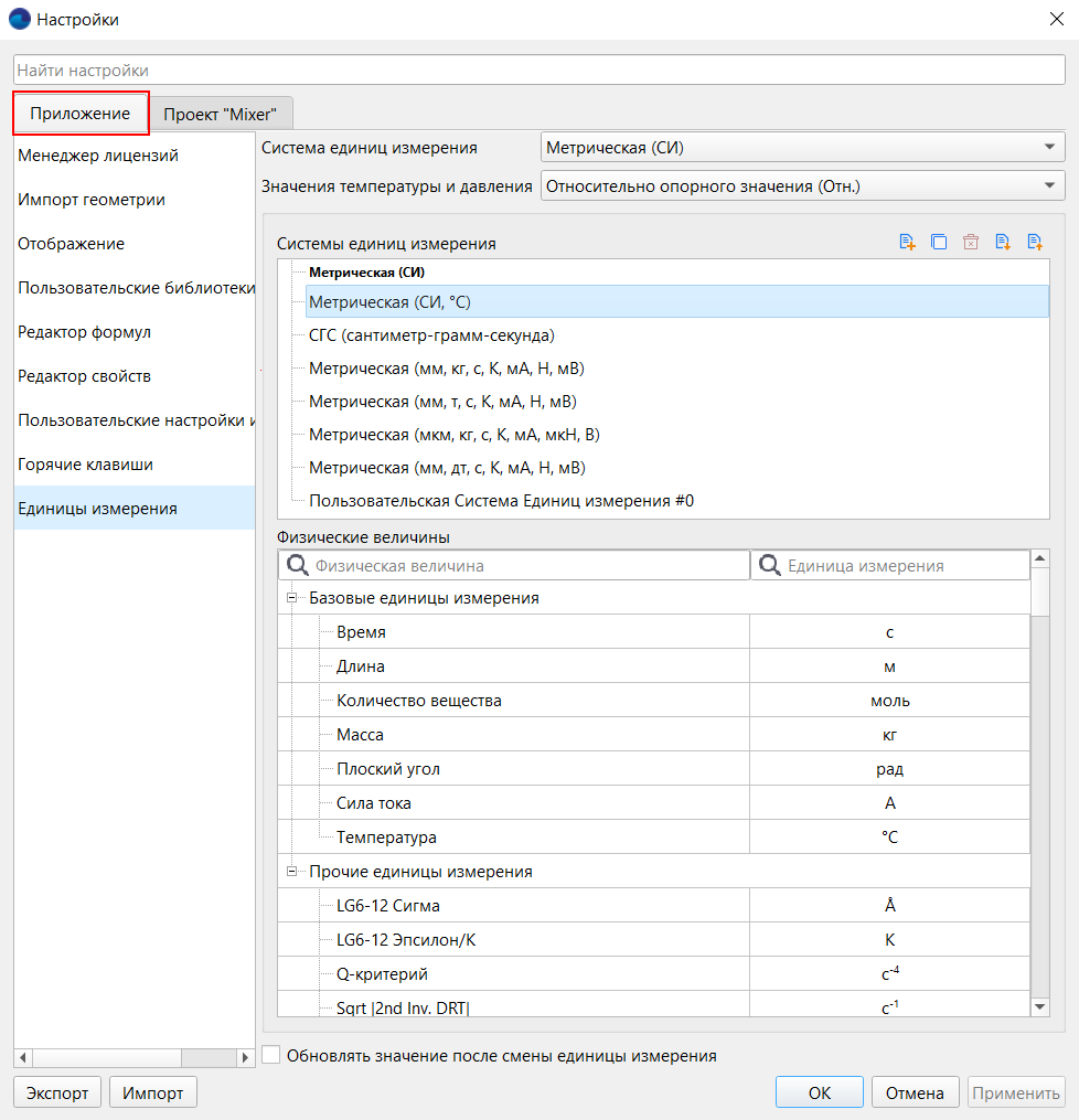 На этой вкладке можно выбрать систему единиц или настроить единицы измерения для данного проекта. После этого значения будут пересчитаны, если включено их обновление на вкладке «Приложение».