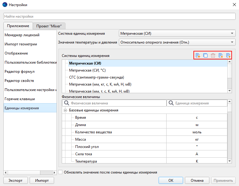 Вы также можете экспортировать/импортировать свои системы единиц измерения при помощи кнопок /