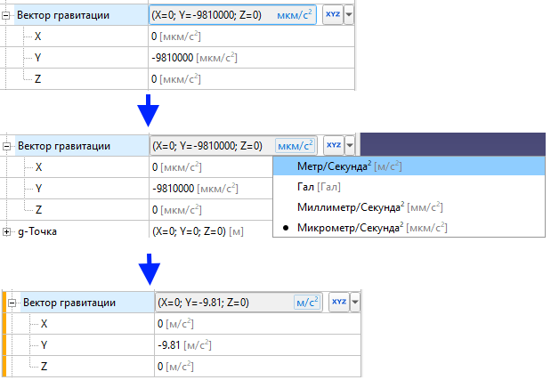 Но единица измерения в головной строке «Вектора гравитации» «синяя», то есть для данной величины можно задать общую настройку сразу для всех трех составляющих. Назначить разные единицы измерения на три составляющие векторов нельзя.