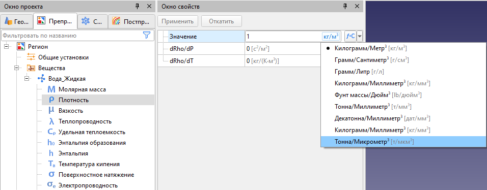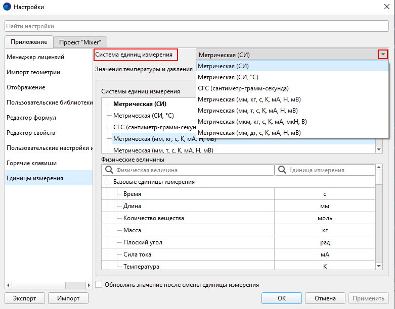 В строке с именем Система единиц измерения при помощи всплывающего списка можно выбрать единицы измерения по умолчанию для всех новых проектов FlowVision: