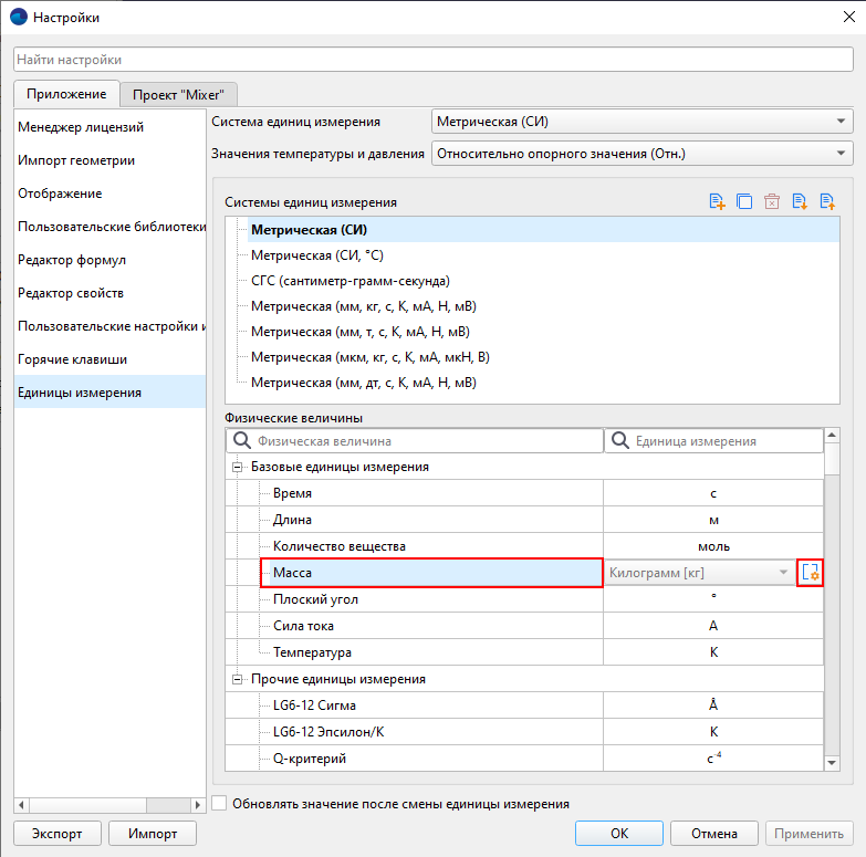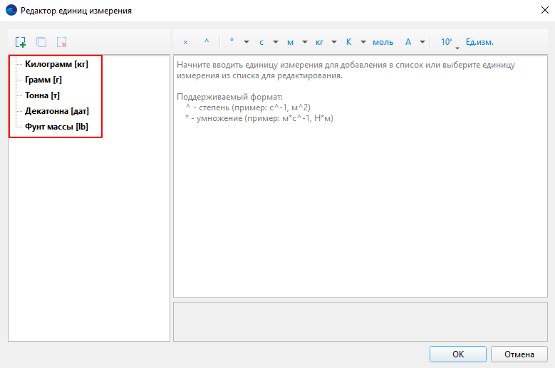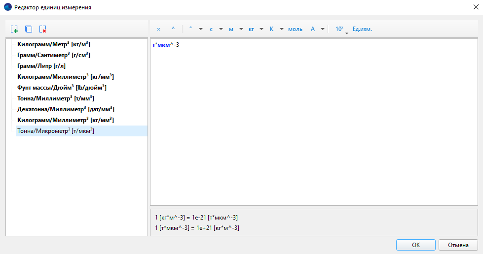 Тут почти как в редакторе формул, можно определить новую, удобную для вас, не базовую (то есть составную или «масштабированную») единицу измерения при помощи кнопки . Формула допускает использование знаков умножения и возведения в степень, поэтому деление будет выглядеть как умножение на единицу в отрицательной степени. Например, я хочу для массы использовать [мг] вместо того, что есть на выбор.
