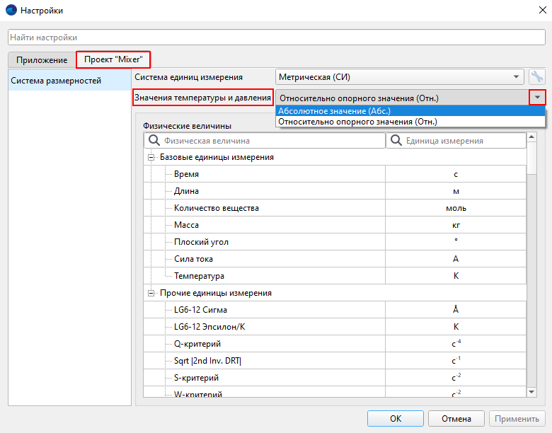 Разберем на примерах подробнее, как это работает. В полях интерфейса, где настраивается температура и давление, вы можете увидеть в скобках подсказку, какой тип значения здесь используется. Например, в опорных величинах давление и температура естественно указываются только в абсолютных значениях: