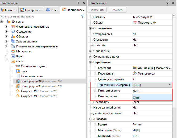Напомню, что программа может автоматически пересчитать значение, как при выборе новой единицы измерения, если такая опция включена. Какое значение, абсолютное или относительное, отображается в интерфейсе, можно понять по сокращению в скобках рядом с именем переменной.