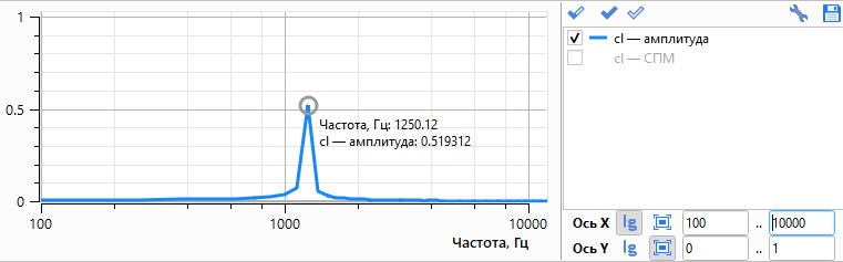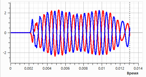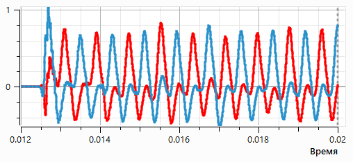 По сравнению с рис. 10 на рис. 13 видно наличие только одной гармоники, что очевидно после использования фильтрации. Расчет среднеквадратичного значения акустического давления дает значение 9,6e-6 Па, что почти в 2 раза выше значения, полученного при совместном расчете. Различие объясняется отсутствием интерференции гармоник.