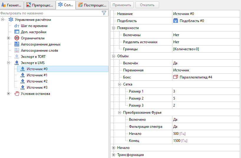 В течение совместного расчёта гидродинамики и акустики в FlowVision имеется возможность накопления и сохранения значения гидродинамического источника в выделенном боксе и в выделенном интервале частот с помощью экспорта в LMS (рис. 11). Для её демонстрации рассмотрим сохранение источника для первой гармоники частоты схода вихрей. Накопление производилось в течение всего совместного расчёта.