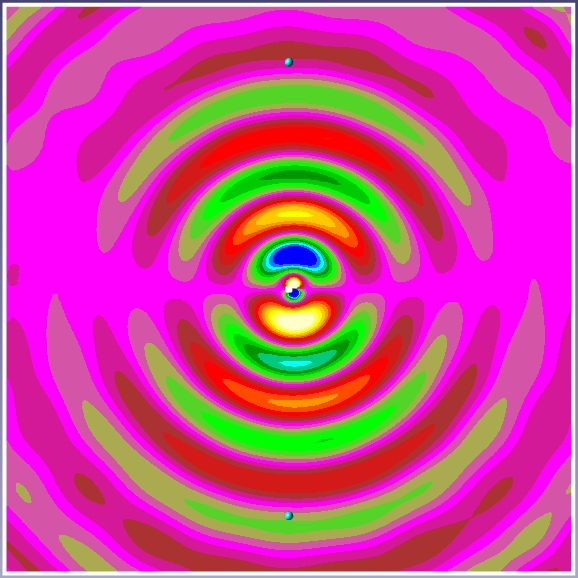 На рис. 12 представлен цветовой слой переменной «Акустическое давление», полученный в результате расчета и использованием Источника 0 (рис. 11). Видно, что поле Акустического давления имеет четко выраженную дипольную структуру, поскольку при сохранении источника были отфильтрованы высшие гармоники.