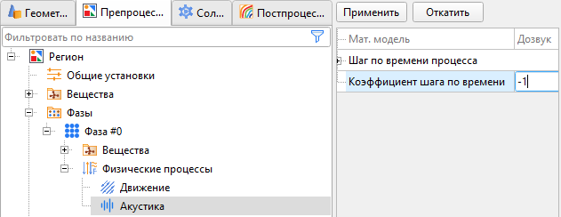 Рис. 4. Задание коэффициента шага по времени для физического процесса «Акустика».