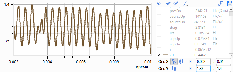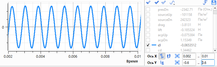 Для количественной верификации гидродинамического расчёта рассмотрим коэффициенты подъёмной силы (cl) и силы сопротивления (cd), изменения которых можно пронаблюдать в окне «Пользовательские величины».